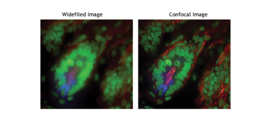Un microscope confocal réalise des images de très faible profondeur de champ en positionnant le plan focal de l’objectif à différents niveaux de profondeur dans l’échantillon. Un balayage (scan) en x-y-z permet de réaliser des séries d’images à partir desquelles on peut obtenir une image 3D.
