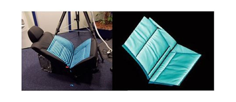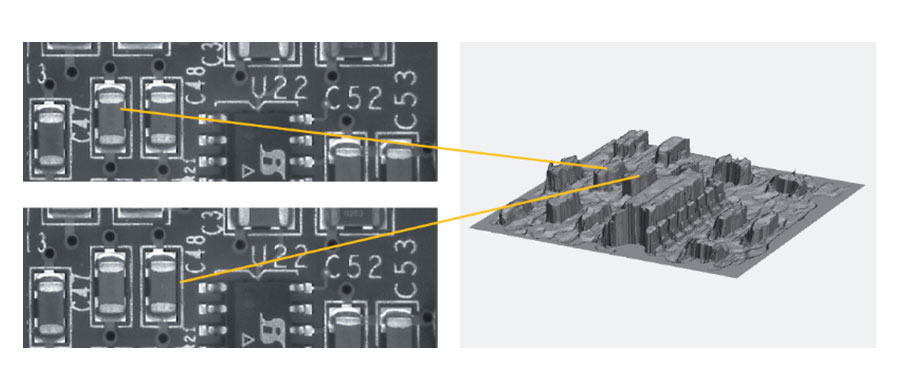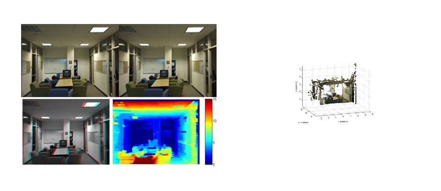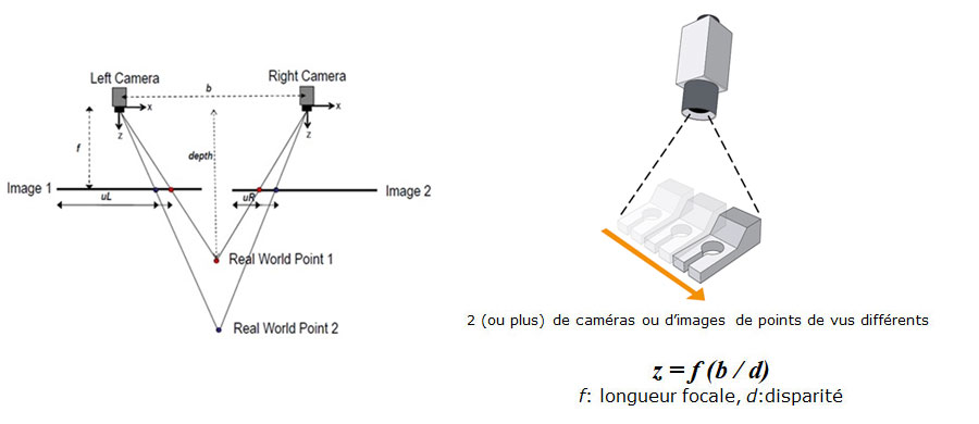 Les coordonnées 3D des points visibles de la surface de l’objet sont déterminées à partir de 2 images (ou plus) de différents points de vue. Ceci est fait en calculant la carte de disparité de la configuration des caméras étalonnées.
