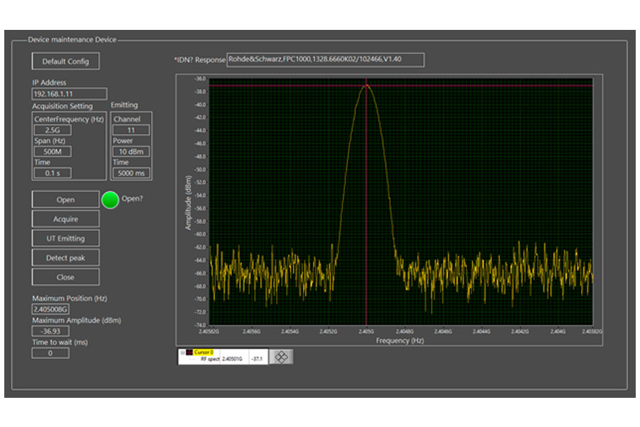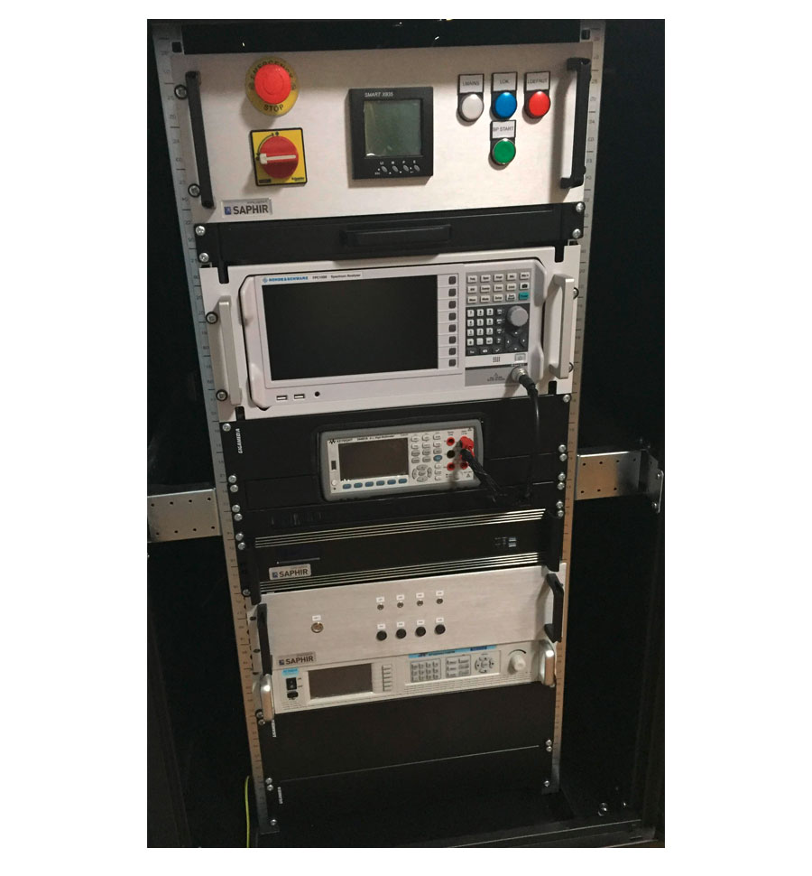 En parallèle, une baie informatique pilote le banc et embarque un périphérique DAQ pour gérer l’interface entre l’ordinateur et les signaux en numérisant les signaux analogiques entrants pour qu’ils soient lisibles par l’ordinateur, un analyseur de spectre pour qualifier l’émission radiofréquence et une alimentation sécurisée.