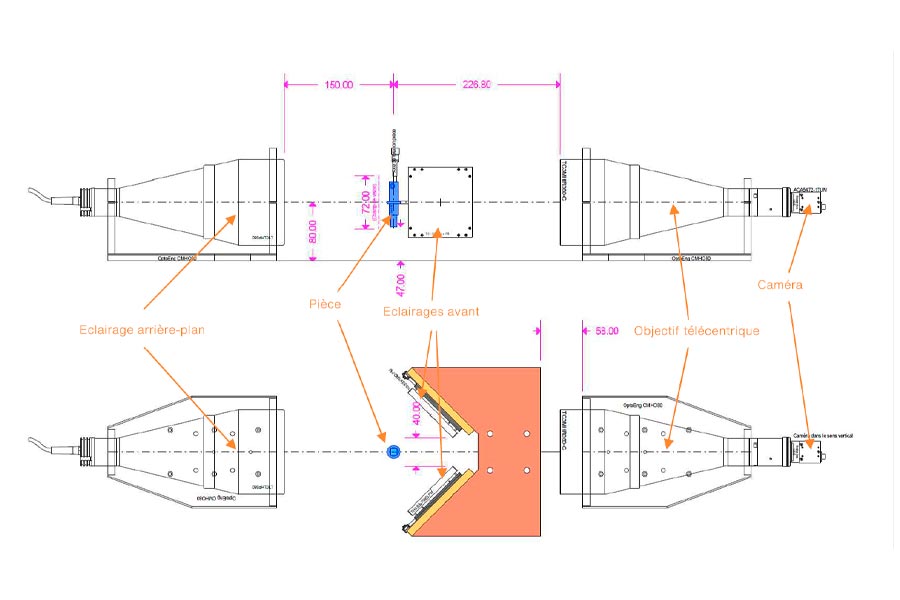 L’objectif du système est de contrôler les dimensions ainsi que l'absence de copeaux et bavures de pièces décolletées de longueur 75mm. Les performances attendues ont imposé :