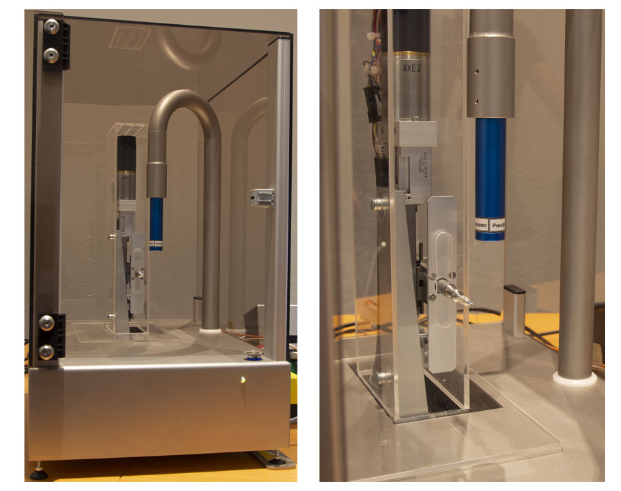 La mesure devant être réalisée à différentes positions axiales et angulaires, une motorisation de la position du produit sous la sonde de mesure a été mise en place.