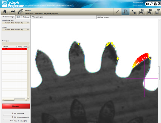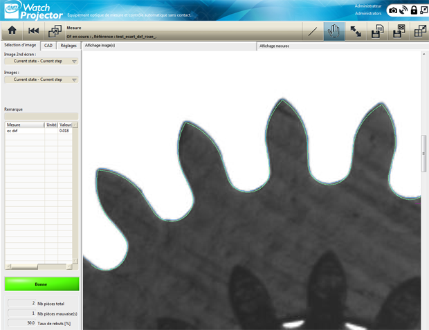 Qualimatest bietet automatische Qualitätskontrolle Lösungen, insbesondere Messeinrichtungen wie WatchProjector. . Um die Wirksamkeit der Ãoeberwachung zu erhöhen, wird CAD-Datei mit der Ãoeberlagerungserfassung und automatische Ausrichtung auf das Werkstück seit 2010. Dieser Fortschritt vorgeschlagen wurde weitgehend von der Industrie geschätzt, aber die endgültige Entscheidung auf der Grundlage der visuellen Lücke blieb Steuerung des Gerichts. Ein Wert der Lücke war auch die hohen Erwartungen der Nutzer.